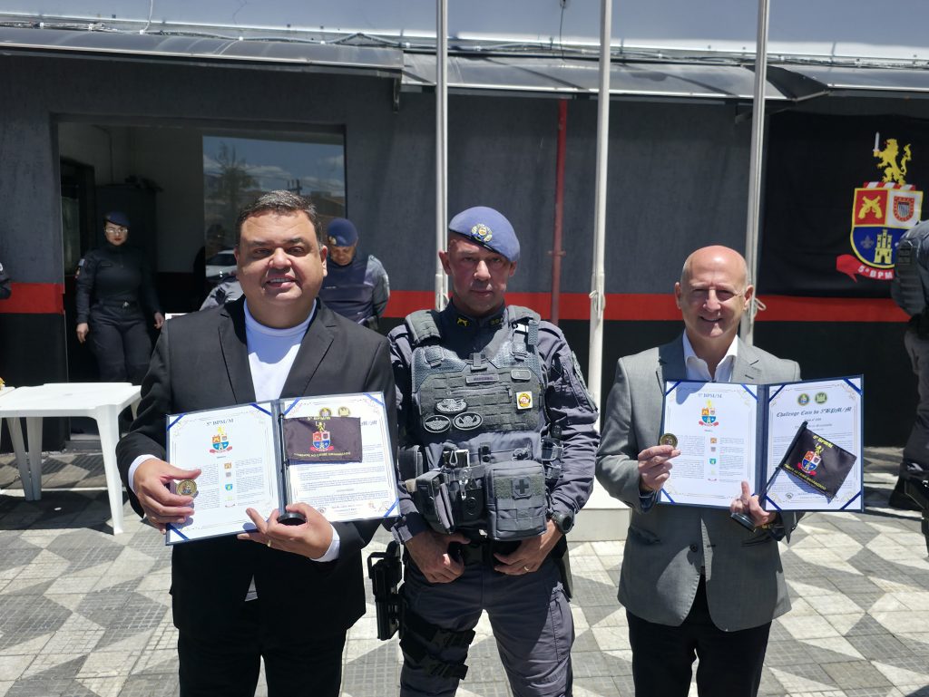 Durante a cerimônia, dedicada a reconhecer o mérito e a dedicação de integrantes da Polícia Militar e de instituições que colaboram com sua missão, recebemos a Challenge Coin, honraria simbólica concedida a personalidades e entidades que fortalecem o trabalho da Corporação.